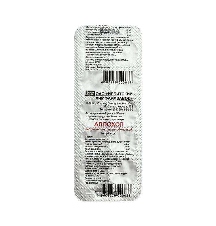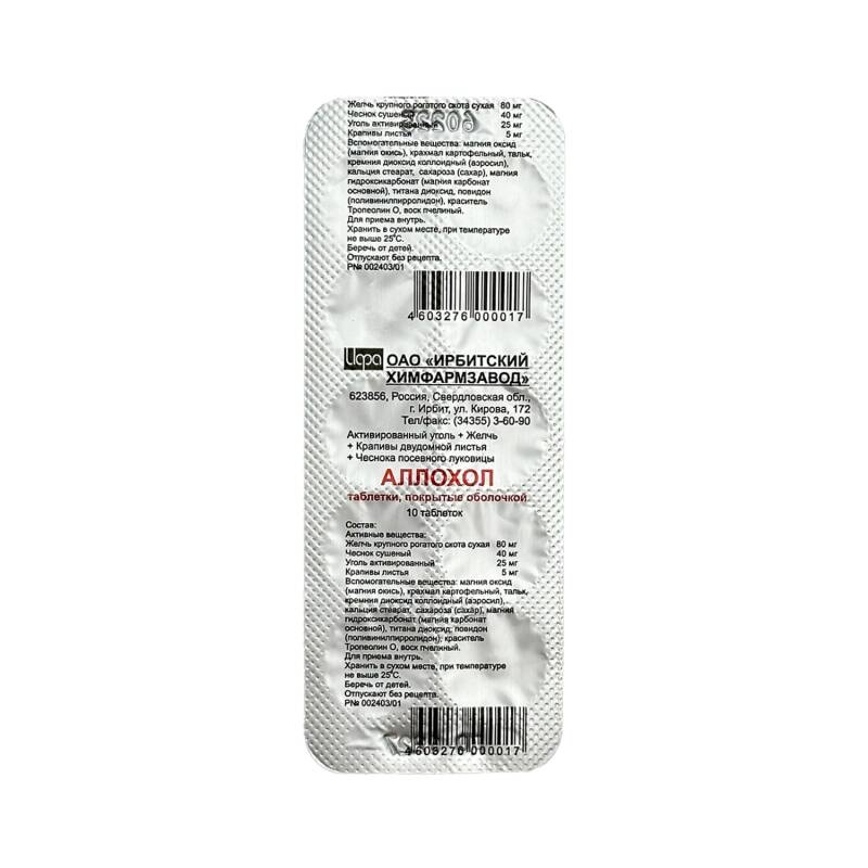Stokda olanda mənə xəbər verin.Alloxol tərkibi, 1 tabletin tərkibində 80 mq iribuynuzlu heyvanın quru ödü, 40 mq quru sarımsaq, 25 mq aktivləşdirilmiş kömür, 5 mq gicitkan yarpağı vardır. Köməkçi maddələr: maqnezium oksid, kartof nişastası, talk, kolloid silisium dioksid (aerosil), kalsium stearat. Örtük: saxaroza (şəkər), maqnezium hidroksikarbonat (əsasi maqnezium karbonat), kolloid silisium dioksid (aerosil), titan dioksid, povidon (polivinilpirrolidon), talk, rəngləyici tropeolin O, arı mumu.