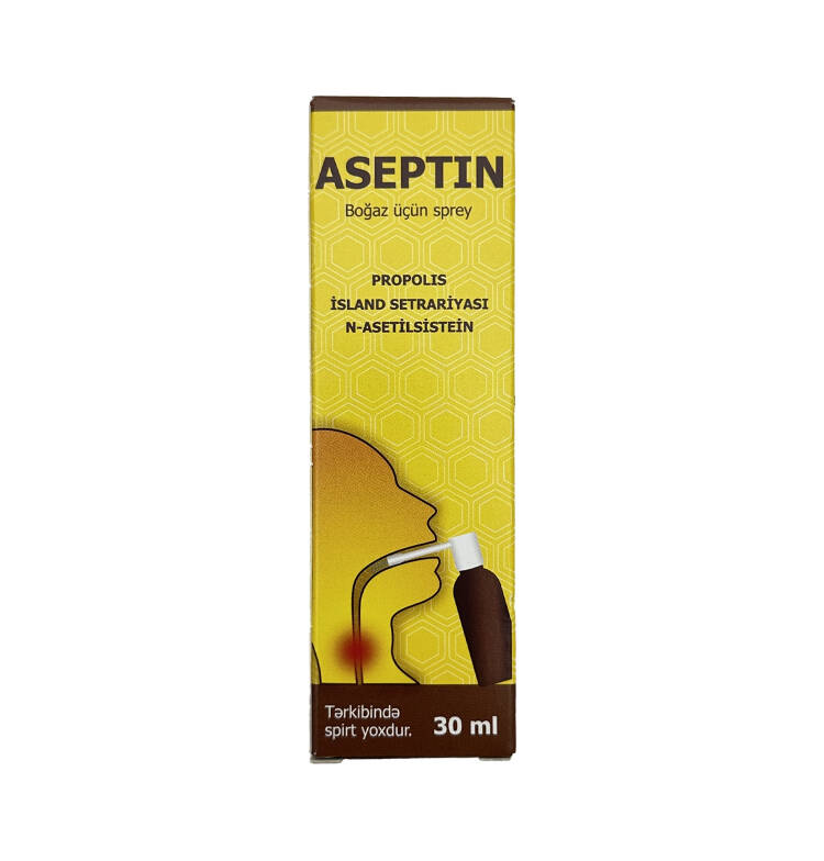 Aseptin sprey formasında təqdim olunur. Serbiya mənşəli Esensa LTD tərəfindən istehsal edilir. İstifadəçi qrupu: 4 yaşdan yuxarı uşaqlar və böyüklər