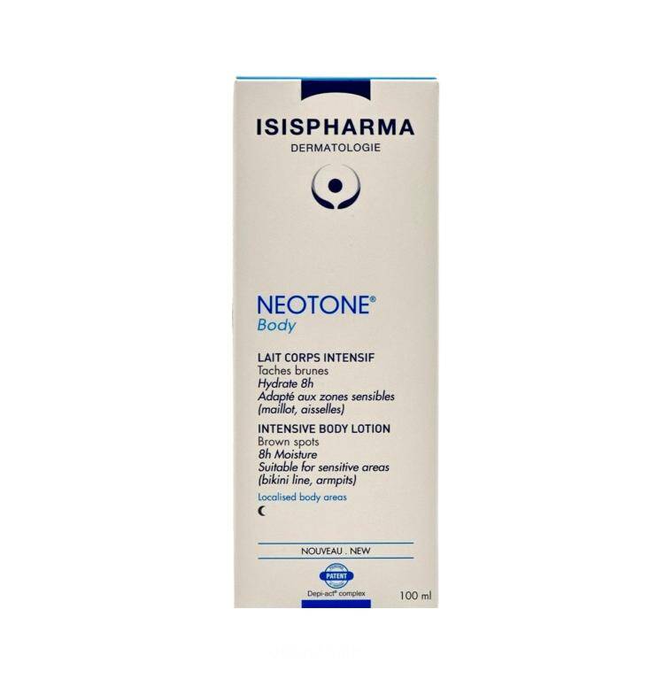 Bədənin müəyyən nahiyələrində, xüsusən də sürtünməyə məruz qalan yerlərdə tünd ləkələrə tətbiq üçün nəzərdə tutulmuş Neotone Body onların rənginin intensivliyini effektiv şəkildə azaldır və yenilikçi Depi-ack kompleksi sayəsində onları aradan qaldırmağa kömək edir. 8 saata qədər dərini nəmləndirir, daha hamar və elastik edir. Həssas nahiyələrə (bikini zonası, qoltuqaltı, diz, dirsək) uyğundur. Günlük istifadəyə uyğundur.
