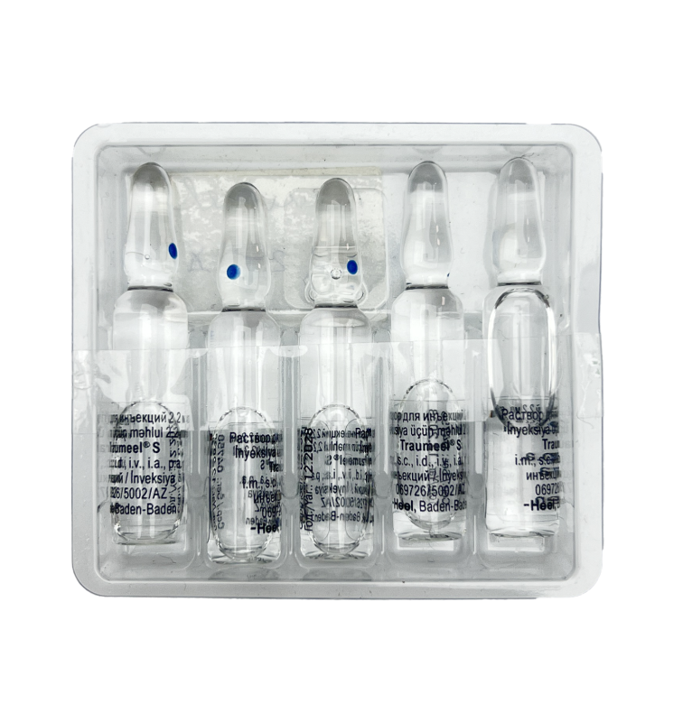 Stokda olanda mənə xəbər verin.Təsiredici maddələr: 2,2 ml-lik (=2,2 q) 1 ampulun tərkibi: Calendula officinalis D2 2,2 mq, Atropa bella-donna D2 2,2 mq, Aconitum napellus D2 1,32 mq, Bellis perennis D2 1,1 mq, Hypericum perforatum D2 0,66 mq, Echinacea D2 0,55 mq, Echinacea purpurea D2 0,55 mq, Symphytum officinale D6 2,2 mq, Matricaria recutita D3 2,2 mq, Achillea millefolium D3 2,2 mq, Mercurius solubilis Hahnemanni D6 1,1 mq, Hepar sulfuris D6 2,2 mq, Hamamelis virginiana D1 0,22 mq, Arnica montana D2 2,2 mq. Köməkçi maddələr: natrium xlorid, inyeksiya üçün su.